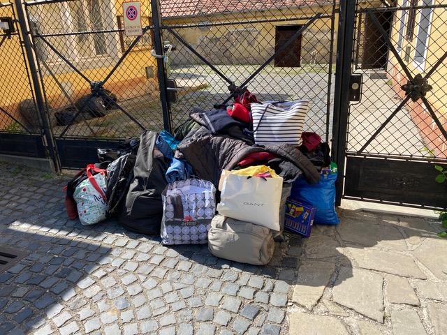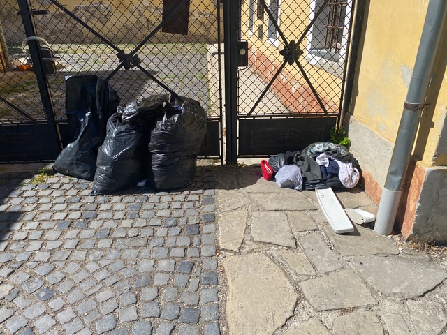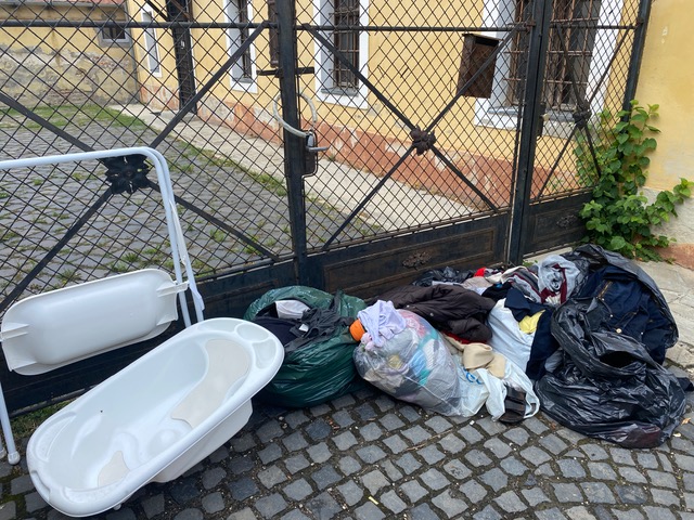 Sajnos többszöri kérésünk és a kirakott tábla ellenére is hetente többször találunk ruhakupacokat a Szent László ház kapuja előtt.