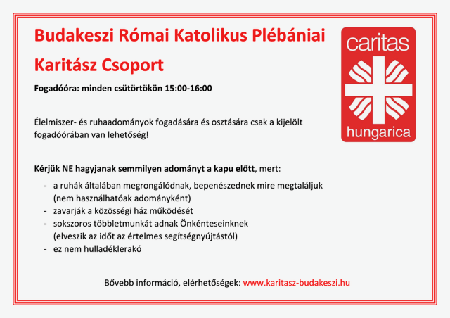 Élelmiszer- és ruhaadományok fogadására és osztására csak a kijelölt fogadóórában van lehetőség (minden csütörtökön 15:00-16:00)!Megértésüket és támogatásukat ezúton is köszönjük!